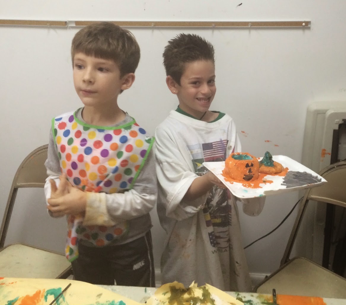 Clay! The kids were excited to work with clay. It was a nice change up. They thought it was the coolest thing to see the clay cut with a wire. The assignment was to make small pumpkin/jack o'lantern covered bowls. They took a hunk of clay, cut it into two balls- one small and one large. Obviously the small one was going to be the lid and the bigger one was for the bowl part.